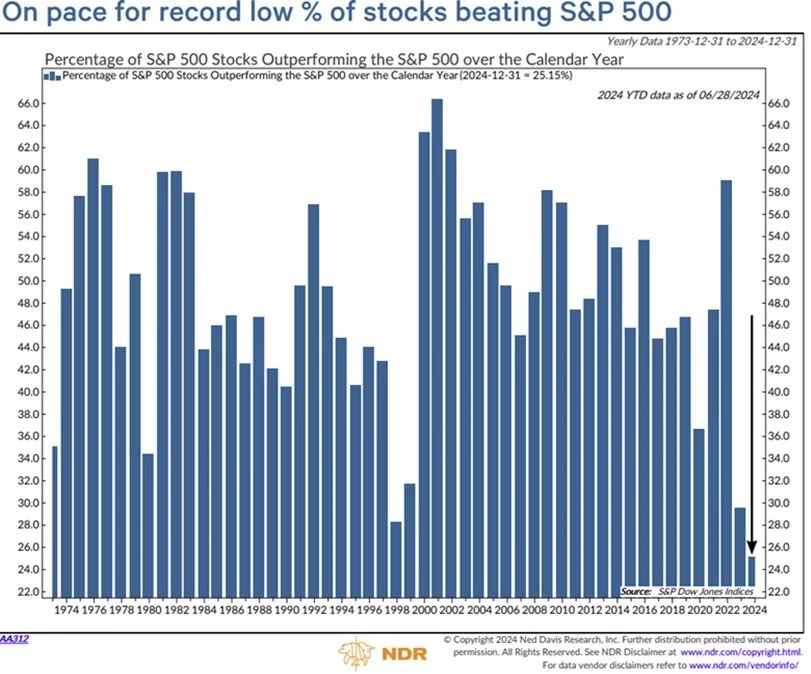 Consider the S&P 500’s recent stellar returns (up 26% in 2023, up 15% in 2024’s first half). The numbers may be misleading because the vast majority of the returns have been generated by a handful of stocks that dominate the top of the index. While on average, we’d expect the S&P 500’s top ten stocks to make up 20% of the index2, the top ten weighting today is just under 36% of the index’s value. It represents an unprecedented level of concentration in what investors perceive as the market’s benchmark index.3