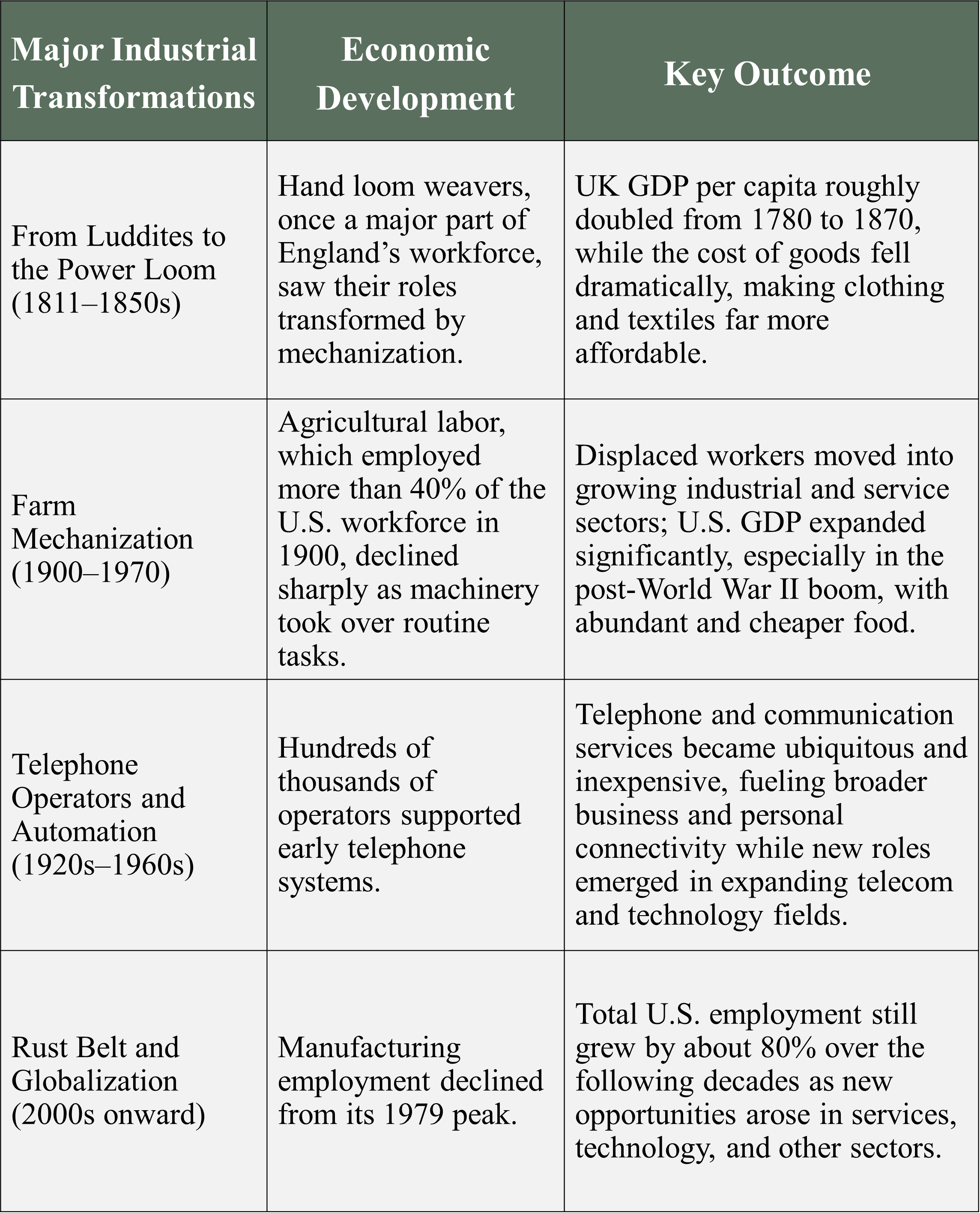 The key takeaway is clear: each of these transitions generated short-term adjustment challenges for specific industries and occupations, yet the broader economic impact was strongly positive. Innovation redirected human effort toward more creative, productive work and amplified overall value.