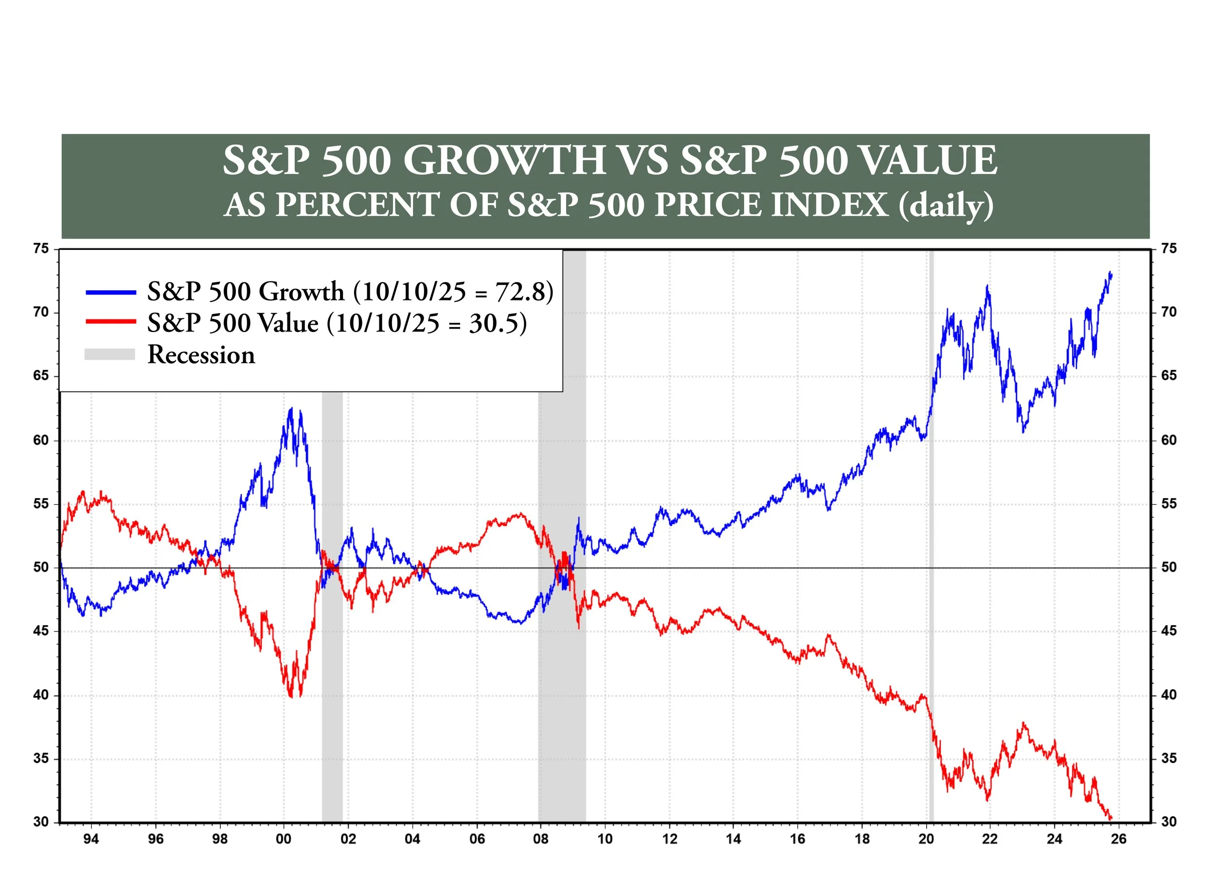 Another reason investors should take heart is that, despite any short-term volatility, significant upside exists, largely due to the continued dominance of growth stocks over value stocks in the market. This, too, will pass, but for now, the growth-value relationship has reached record levels of imbalance. Well into 2025, growth stocks maintain an unprecedented performance advantage over value stocks, a trend dating back to 2009. Opportunity is plentiful on the other side of the market’s excesses.