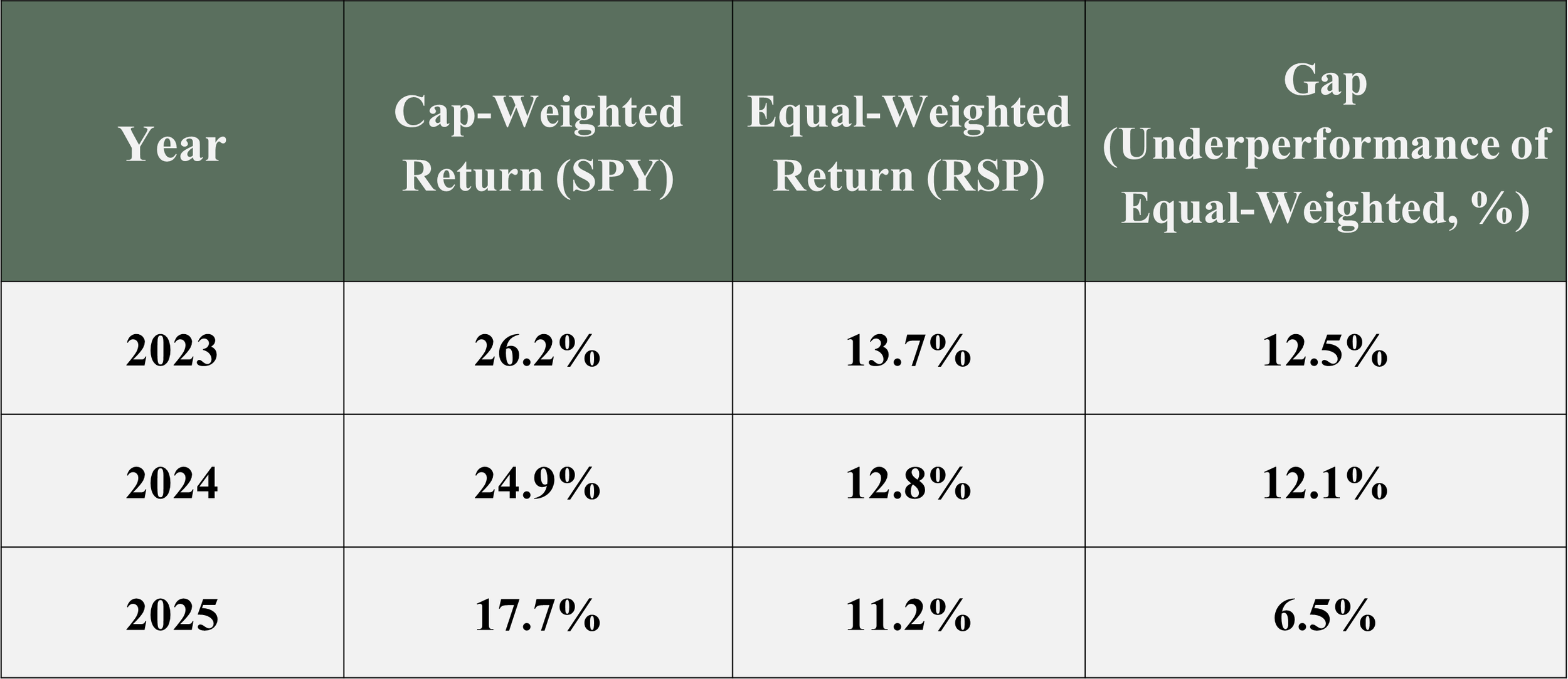The prior narrowness stemmed from the S&P 500’s market-cap weighting, where the largest stocks exerted outsized influence. Massive inflows into the Magnificent Seven (Alphabet, Amazon, Apple, Meta, Microsoft, Nvidia, Tesla) drove their prices and market caps higher, ballooning their combined weighting of the S&P 500 index to approximately 34-35% by the end of 2025. This made the cap-weighted index (SPY) appear far stronger than the broader market in 2023-2024, masking limited participation from the “other 493” stocks.